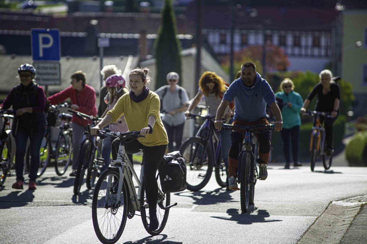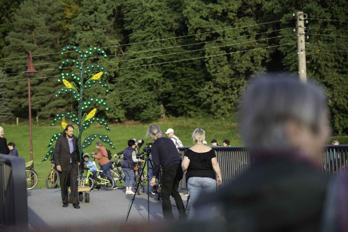 In ca. vier Stunden ging es, angeführt von Bürgermeister Cornelius Stempel, mit dem Fahrrad zu Stätten aktueller und ehemaliger Arbeit, in denen 13 Projekte aus den Bereichen Bildende Kunst, Performance, Theater, Tanz, Film, Zeitgeschichte von Künstler*innen u.a. aus Wien, Hamburg, Berlin, Leipzig, Eibau und Dresden im Wortsinn zu erfahren waren. Der Parcours endete am Festzelt am Lutherplatz; dort begann im Anschluss die Kirmes des Ortes. Der Eintritt war frei. Ein eigenes Fahrrad war nach Möglichkeit zum Treffpunkt mitzubringen.